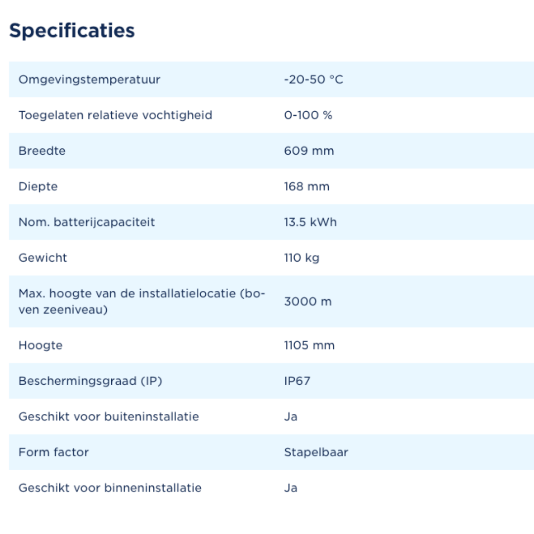 Extra capaciteit: Elke uitbreidingsunit voegt 13.5 kWh aan bruikbare energieopslag toe, dezelfde capaciteit als de hoofdeenheid.